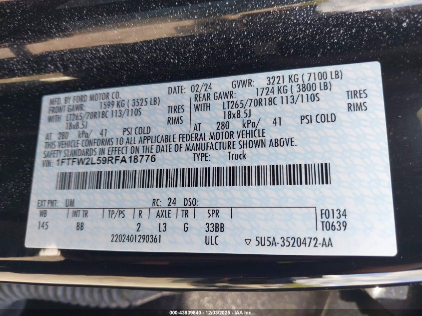 2024 FORD F-150 2024 року Бензин, 5.0, Полный привод, vin - 1FTFW2L59RFA18776 из США