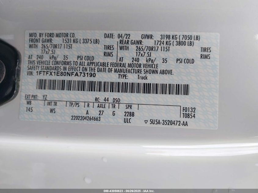 2022 FORD F-150 2022 року Бензин, 3.5, Полный привод, vin - 1FTFX1E80NFA73190 из США
