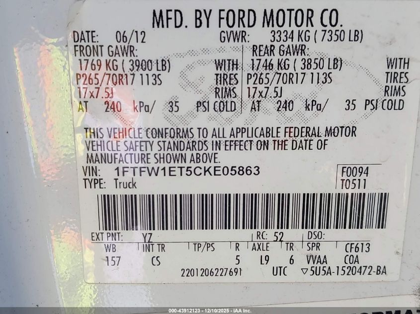 2012 FORD F-150 2012 року Бензин, 3.5, Полный привод, vin - 1FTFW1ET5CKE05863 из США