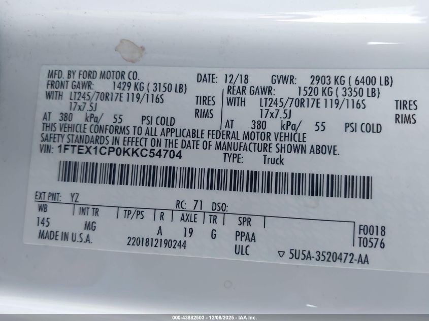 2019 FORD F-150 2019 року Бензин, 2.7, , vin - 1FTEX1CP0KKC54704 из США