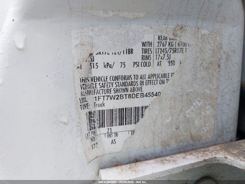 Цвет БелыйЦилиндры 8Привод Полный приводVIN 1FT7W2BT8DE******Состояние НеизвестноПовреждения ЗадняяДата аукциона 2025-06-25