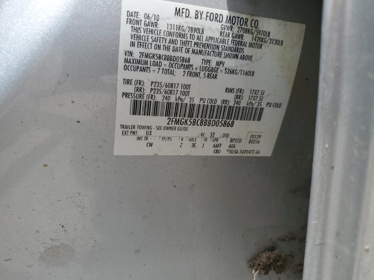 Цвет СеребряныйЦилиндры 6VIN 2FMGK5BC8BBD05868Состояние НеизвестноПовреждения Передняя или задняяДата аукциона 2025-08-15