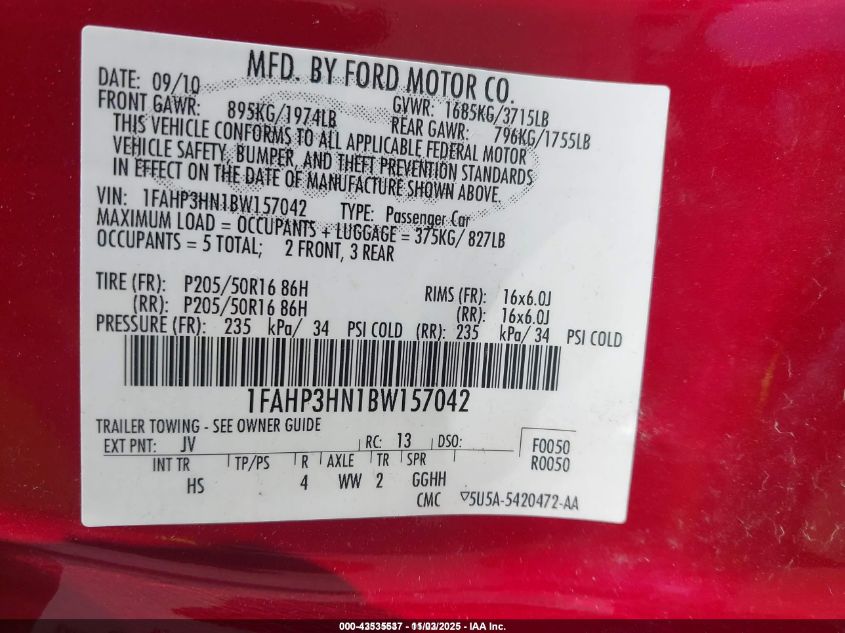 2011 FORD FOCUS 2011 року Бензин, 2.0, Передний привод, vin - 1FAHP3HN1BW157042 из США