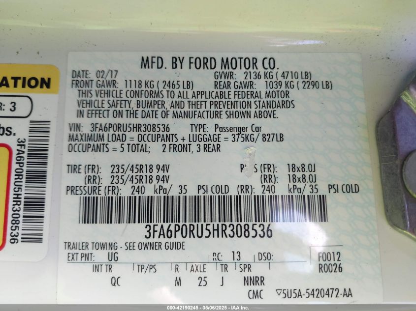 2017 FORD FUSION HYBRID 2017 року Гибрид, 2.0, Передний привод, vin - 3FA6P0RU5HR308536 из США