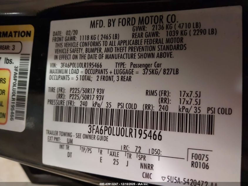 Цвет ЧерныйЦилиндры 4Привод Передний приводVIN 3FA6P0LU0LR195466Состояние СтационарноПовреждения Передняя правая AutoRIA