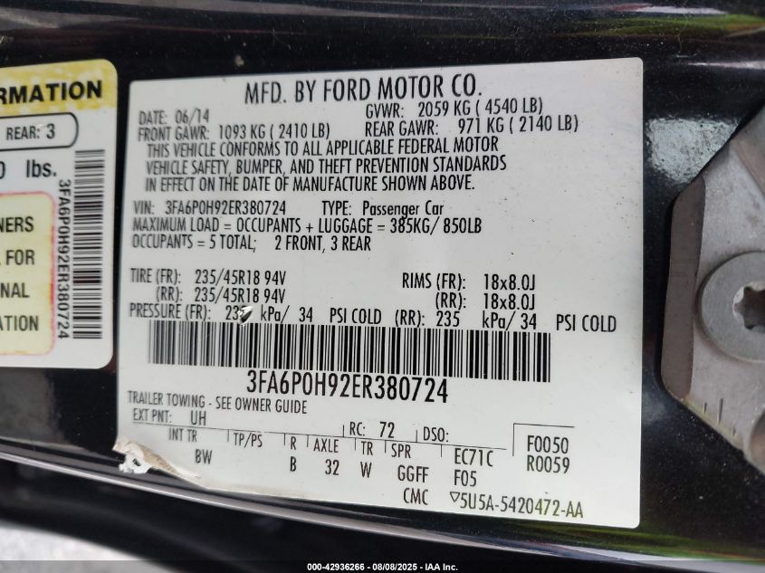 2014 FORD FUSION 2014 року Бензин, 2.0, Передний привод, vin - 3FA6P0H92ER380724 из США