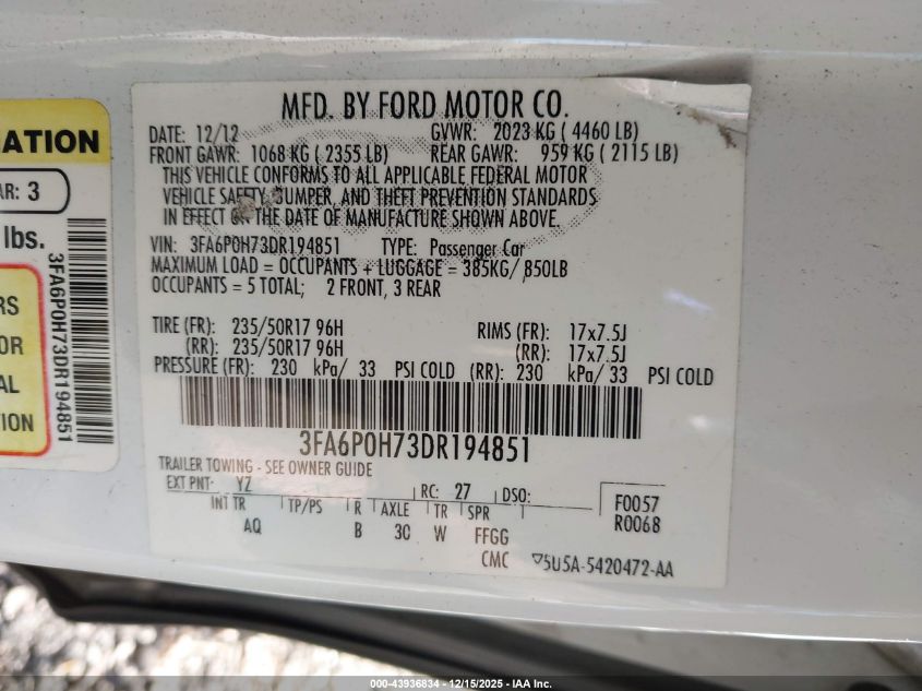 2013 FORD FUSION 2013 року Бензин, 2.5, Передний привод, vin - 3FA6P0H73DR194851 из США