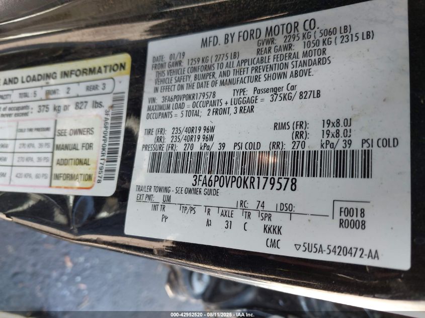 2019 FORD FUSION 2019 року Бензин, 2.7, Полный привод, vin - 3FA6P0VP0KR****** из США