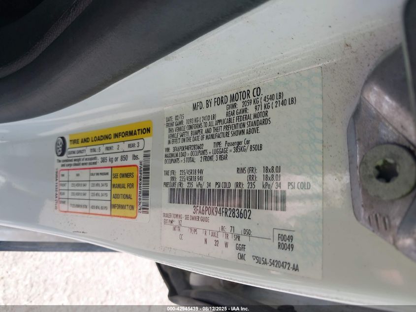 2015 FORD FUSION 2015 року Бензин, 2.0, Передний привод, vin - 3FA6P0K94FR283602 из США