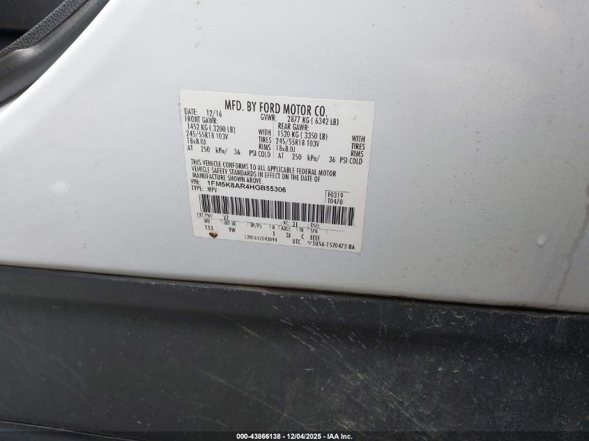 Цвет БелыйЦилиндры 6Привод Полный приводVIN 1FM5K8AR4HGB55306Состояние СтационарноПовреждения Передняя или задняя