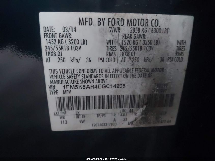Цвет СинийЦилиндры 6Привод Полный приводVIN 1FM5K8AR4EGC14205Состояние СтационарноПовреждения Правая сторонаДата аукциона 2025-12-15