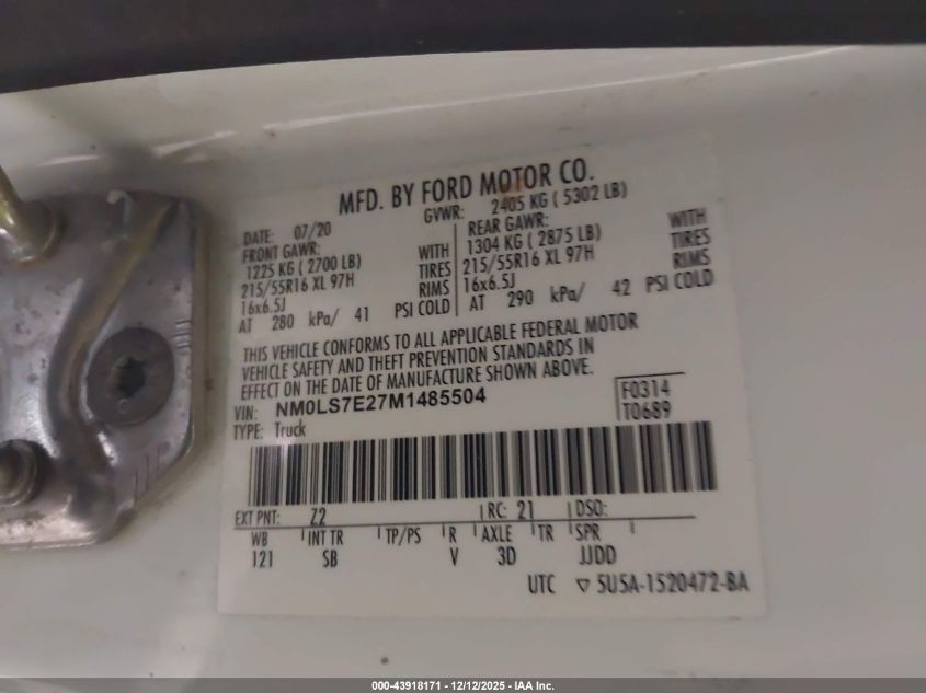 2021 FORD TRANSIT CONNECT 2021 року Бензин, 2.0, Передний привод, vin - NM0LS7E27M1485504 из США