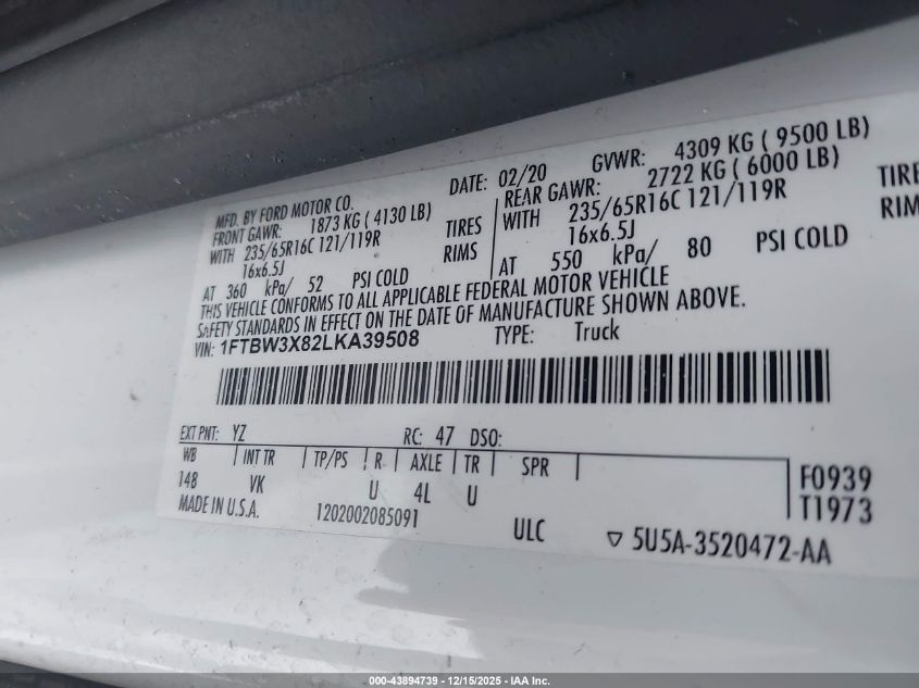 2020 FORD TRANSIT 2020 року Бензин, 3.5, Задний привод, vin - 1FTBW3X82LKA39508 из США