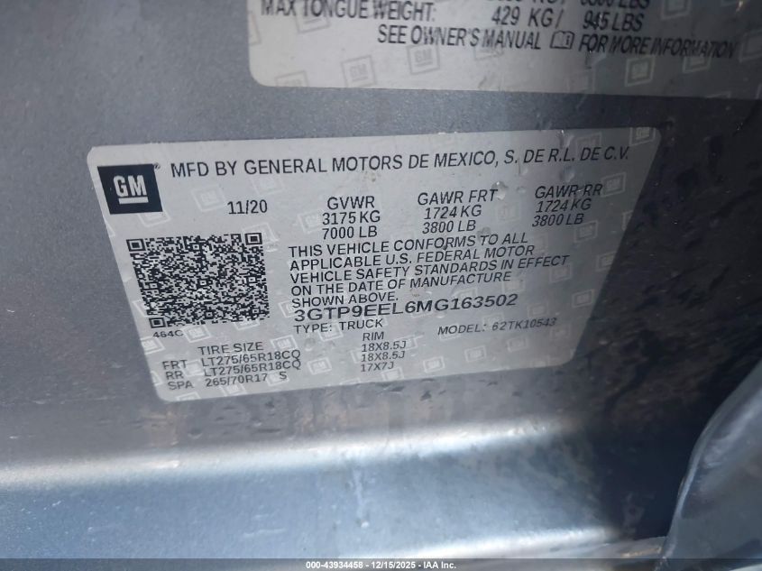 2021 GMC SIERRA 1500 2021 року Бензин, 6.2, Полный привод, vin - 3GTP9EEL6MG163502 из США