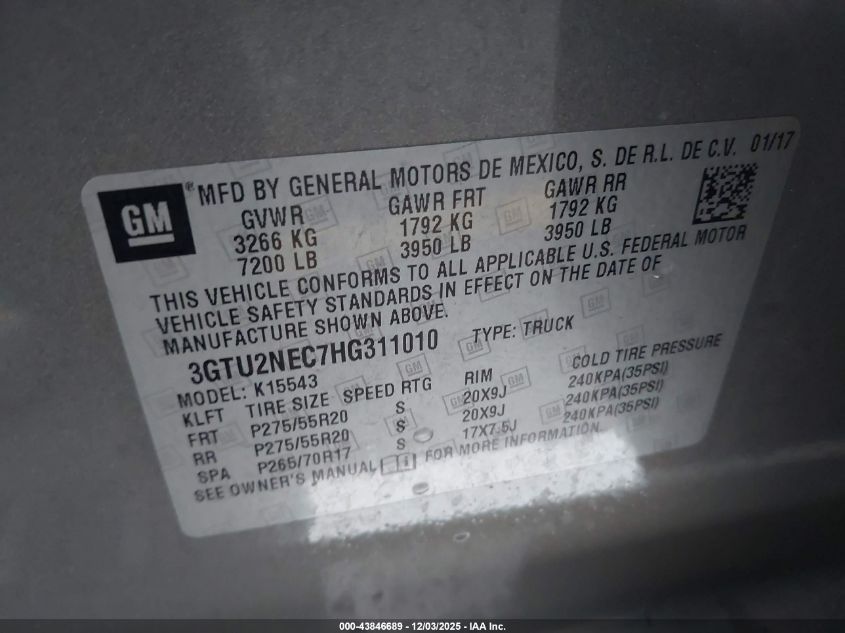 2017 GMC SIERRA 1500 2017 року Бензин, 5.3, Полный привод, vin - 3GTU2NEC7HG311010 из США