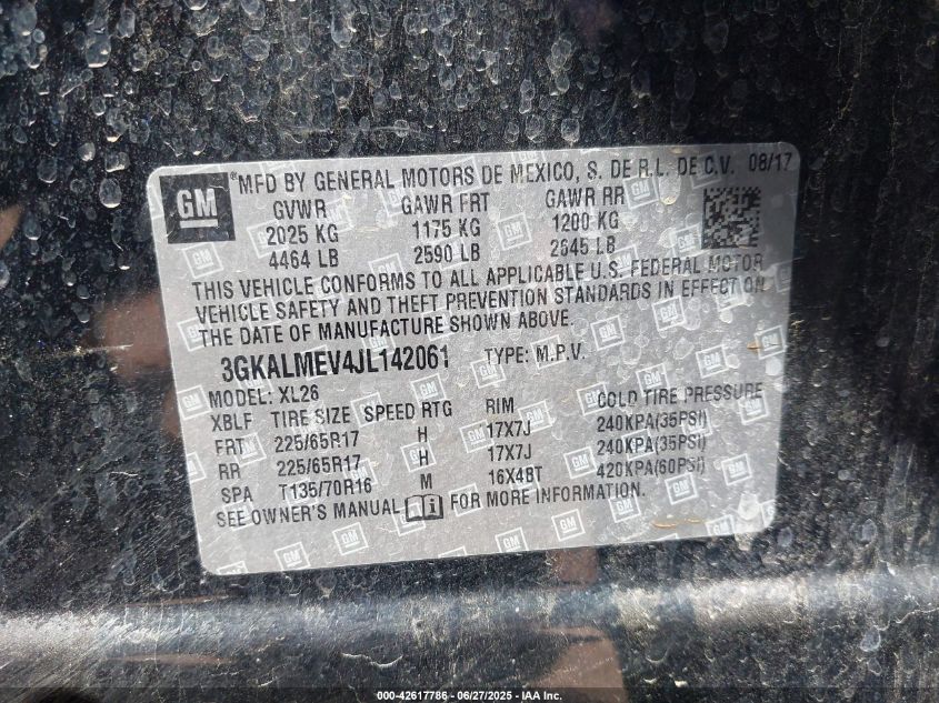 Цвет ЧерныйЦилиндры 4Привод Передний приводVIN 3GKALMEV4JL******Состояние НеизвестноПовреждения Передняя или задняяДата аукциона 2025-08-26