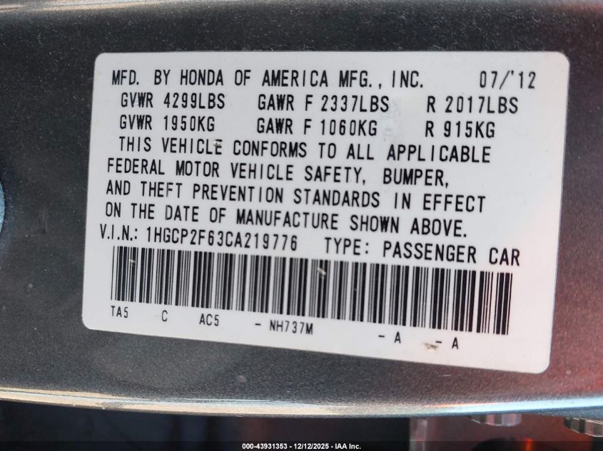 2012 HONDA ACCORD 2012 року Бензин, 2.4, Передний привод, vin - 1HGCP2F63CA219776 из США