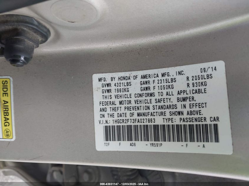 2015 HONDA ACCORD 2015 року Бензин, 2.4, Передний привод, vin - 1HGCR2F73FA027863 из США