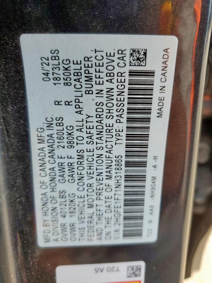 2022 HONDA CIVIC 2022 року Бензин, 1.5, , vin - 2HGFE1F71NH318865 из США