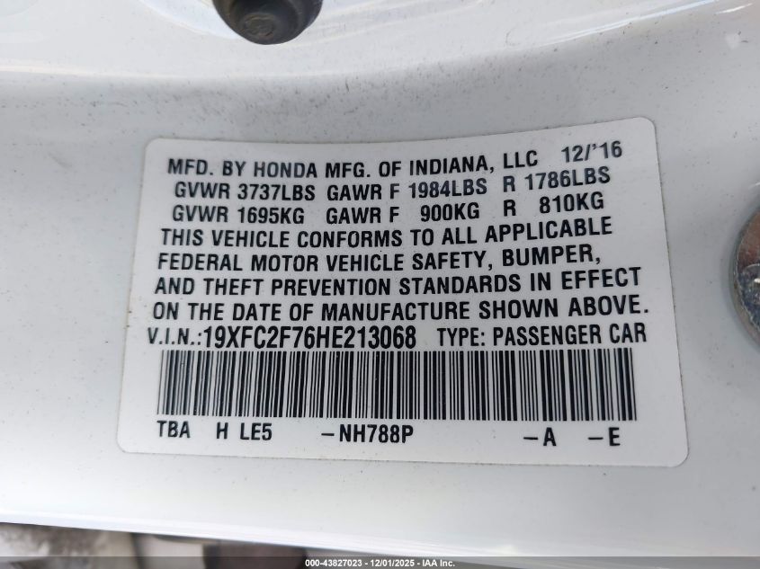 2017 HONDA CIVIC 2017 року Бензин, 2.0, Передний привод, vin - 19XFC2F76HE213068 из США