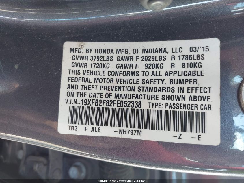 2015 HONDA CIVIC 2015 року Бензин, 1.8, Передний привод, vin - 19XFB2F82FE052338 из США