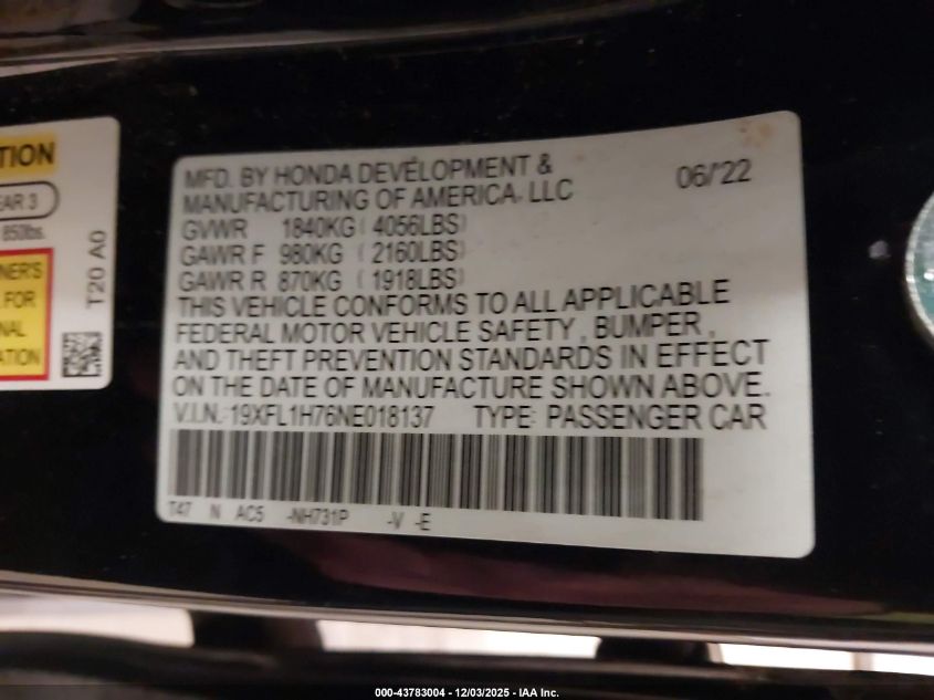 2022 HONDA CIVIC 2022 року Бензин, 1.5, Передний привод, vin - 19XFL1H76NE018137 из США