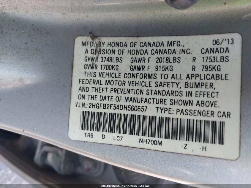 2013 HONDA CIVIC 2013 року Бензин, 1.8, Передний привод, vin - 2HGFB2F54DH560657 из США