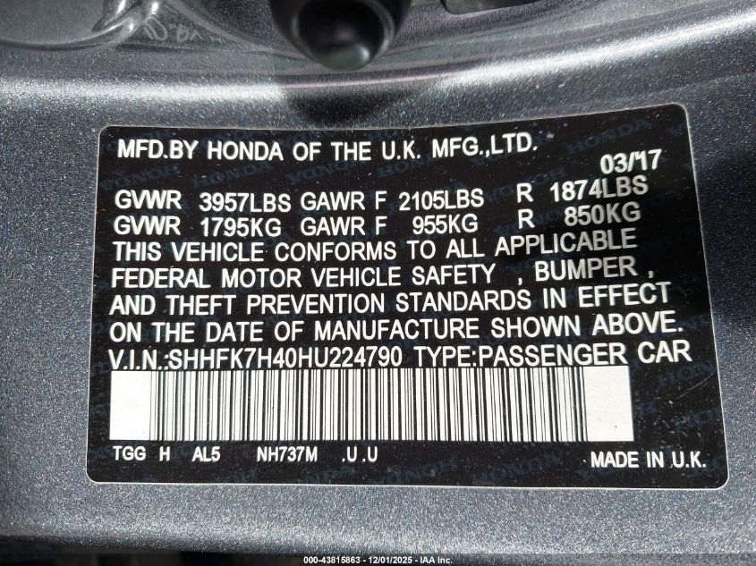 2017 HONDA CIVIC 2017 року Бензин, 1.5, Передний привод, vin - SHHFK7H40HU224790 из США