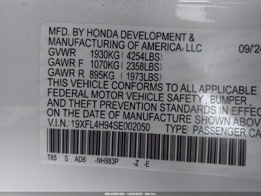 2025 HONDA CIVIC 2025 року Гибрид, 2.0, Передний привод, vin - 19XFL4H94SE002050 из США