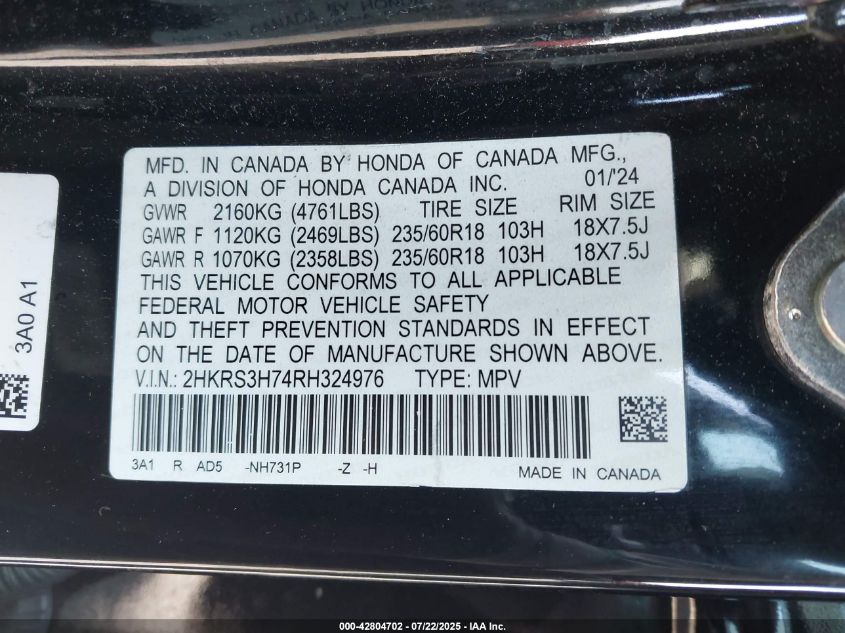 2024 HONDA CR-V 2024 року Бензин, 1.5, Передний привод, vin - 2HKRS3H74RH****** из США
