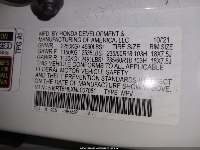 2022 HONDA CR-V HYBRID 2022 року Гибрид, 2.0, Полный привод, vin - 5J6RT6H8XNL****** из США