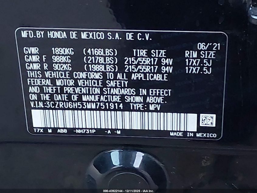 2021 HONDA HR-V 2021 року Бензин, 1.8, Полный привод, vin - 3CZRU6H53MM751914 из США
