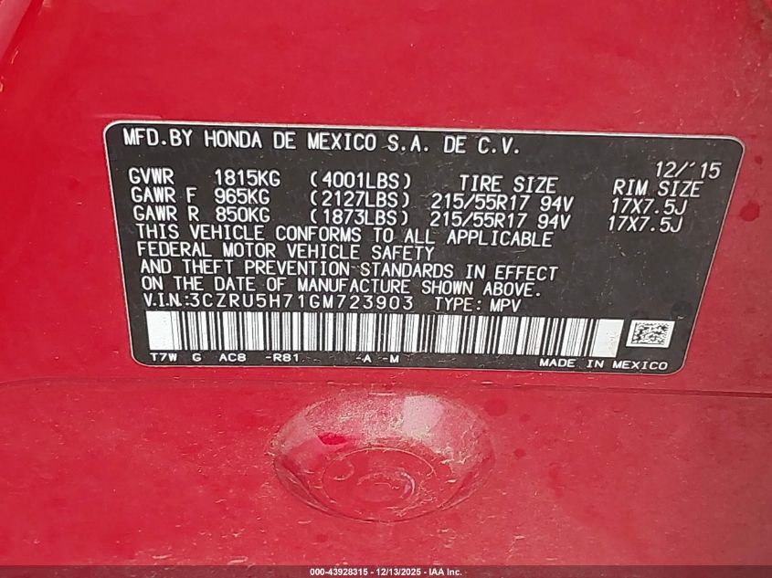 2016 HONDA HR-V 2016 року Бензин, 1.8, Передний привод, vin - 3CZRU5H71GM723903 из США