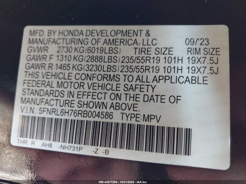 Цвет ЧерныйЦилиндры 6Привод Передний приводVIN 5FNRL6H76RB004586Состояние СтационарноПовреждения Передняя или задняя AutoRIA