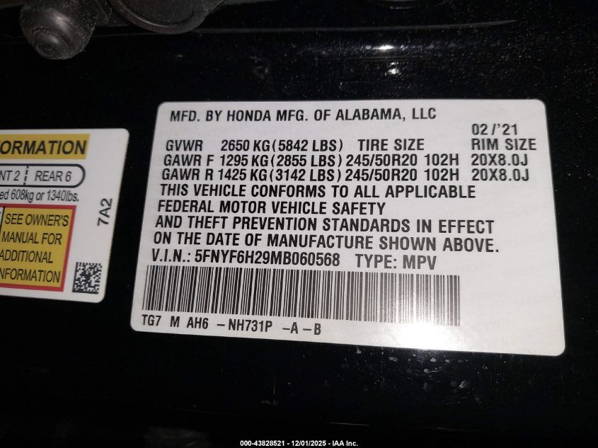 2021 HONDA PILOT 2021 року Бензин, 3.5, Полный привод, vin - 5FNYF6H29MB060568 из США