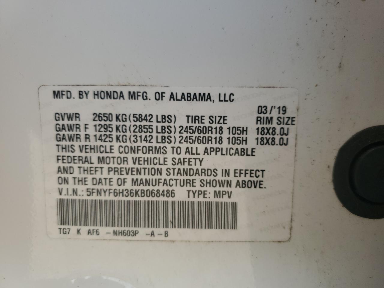 2019 HONDA PILOT 2019 року Бензин, 3.5, Полный привод, vin - 5FNYF6H36KB068486 из США