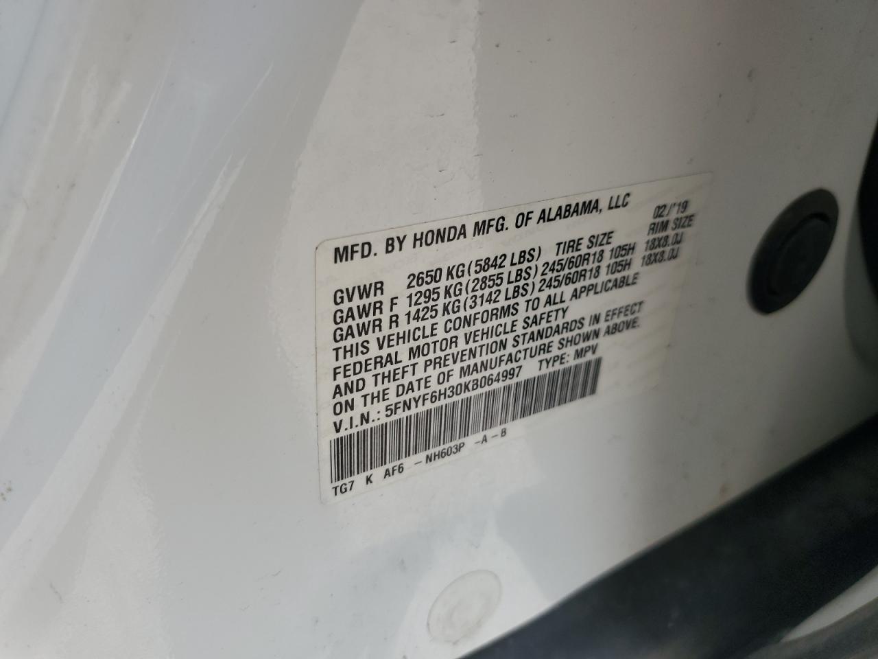 2019 HONDA PILOT 2019 року Бензин, 3.5, Полный привод, vin - 5FNYF6H30KB064997 из США