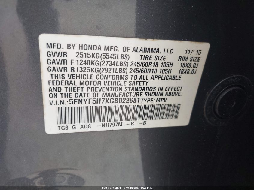 2016 HONDA PILOT EXL