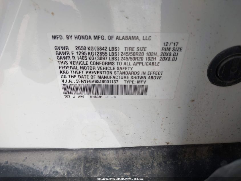 Цвет БелыйЦилиндры 6Привод Полный приводVIN 5FNYF6H95JB******Состояние НеизвестноПовреждения Передняя или задняяДата аукциона 2025-10-01