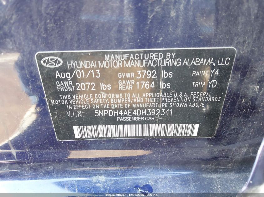 2013 HYUNDAI ELANTRA 2013 року Бензин, 1.8, Передний привод, vin - 5NPDH4AE4DH392341 из США