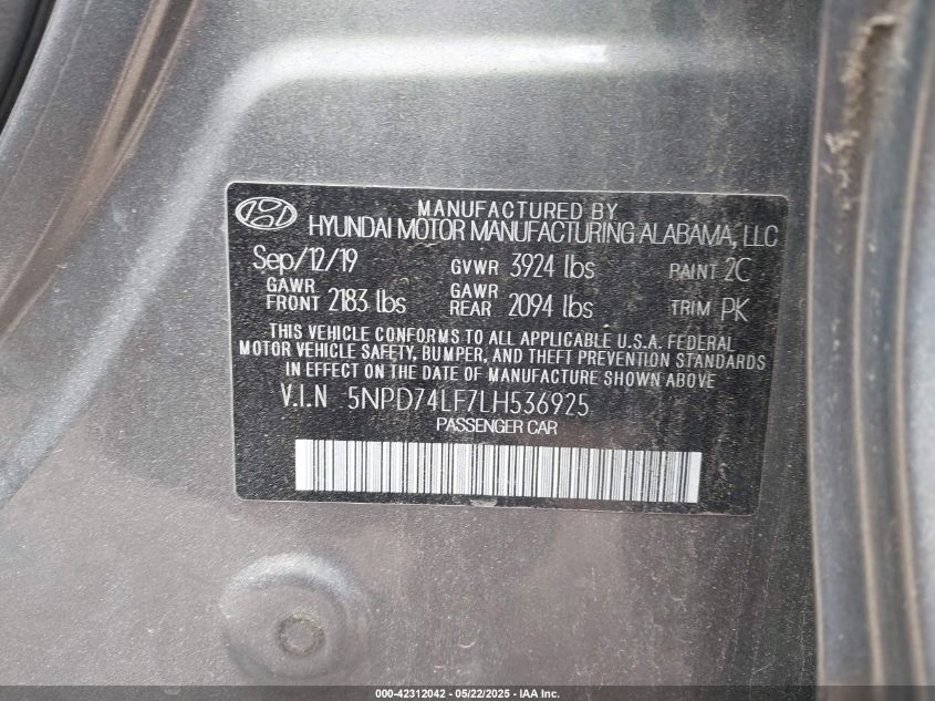 2020 HYUNDAI ELANTRA 2020 року Бензин, 2.0, Передний привод, vin - 5NPD74LF7LH****** из США