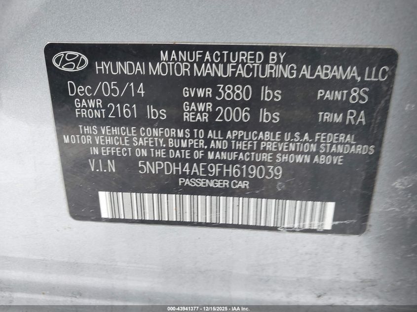 2015 HYUNDAI ELANTRA 2015 року Бензин, 1.8, Передний привод, vin - 5NPDH4AE9FH619039 из США