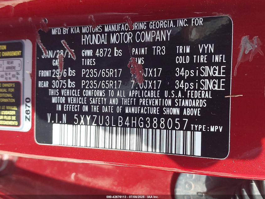 Цвет КрасныйЦилиндры 4Привод Передний приводVIN 5XYZU3LB4HG388057Состояние Заводится и едет (проверено)Повреждения Передняя или задняяДата аукциона 2025-12-10 AutoRIA