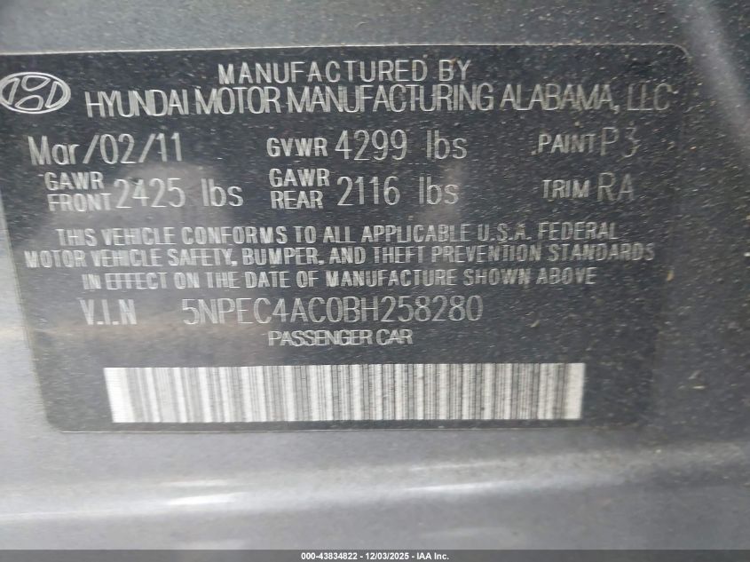 2011 HYUNDAI SONATA 2011 року Бензин, 2.4, Передний привод, vin - 5NPEC4AC0BH258280 из США