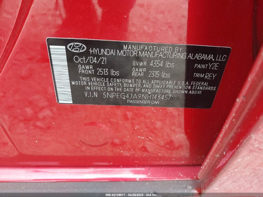Цвет КрасныйЦилиндры 4Привод Передний приводVIN 5NPEG4JA9NH******Состояние НеизвестноПовреждения Передняя или задняяДата аукциона 2025-09-19
