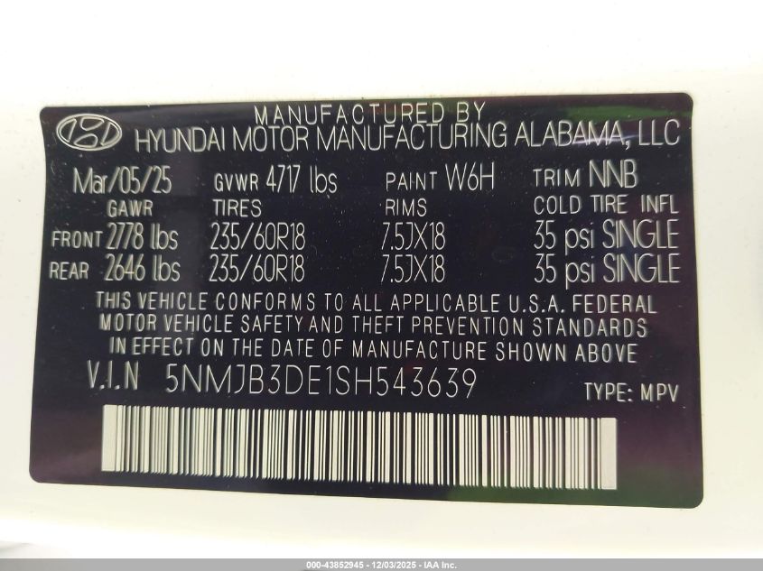2025 HYUNDAI TUCSON 2025 року Бензин, 2.5, Передний привод, vin - 5NMJB3DE1SH543639 из США