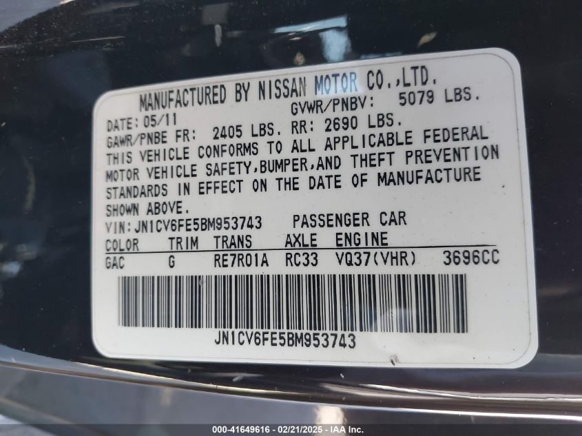 Цвет ЧерныйЦилиндры 6Привод Задний приводVIN JN1CV6FE5BM******Состояние НеизвестноПовреждения Передняя или задняяДата аукциона 2025-09-08