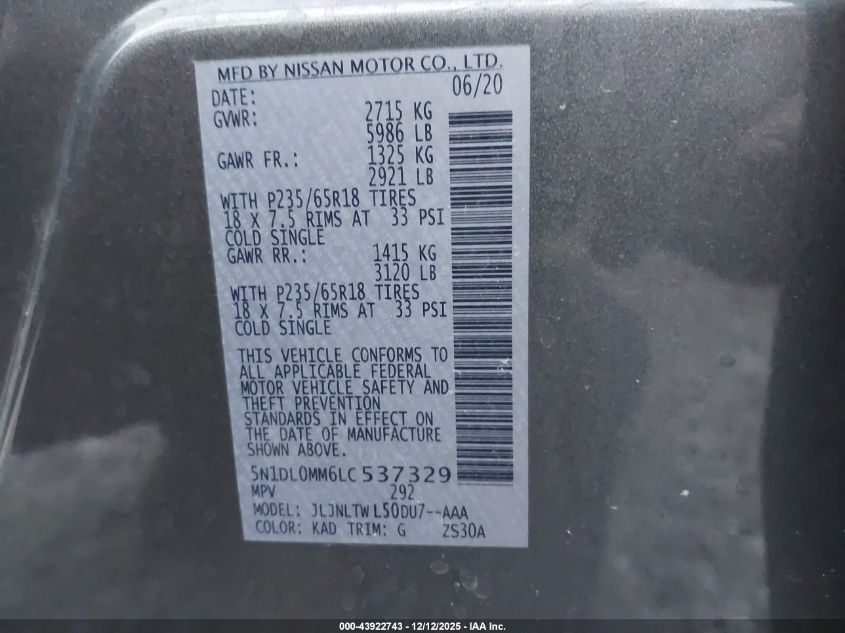 Цвет СерыйЦилиндры 6Привод Полный приводVIN 5N1DL0MM6LC537329Состояние Заводится и едет (проверено)Повреждения Передняя или задняя AutoRIA