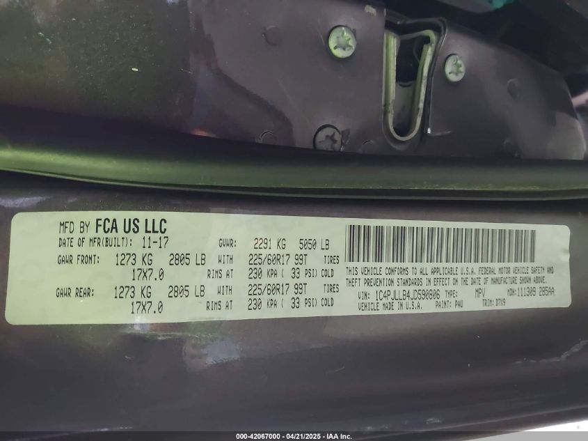 Цвет СерыйЦилиндры 4Привод Передний приводVIN 1C4PJLLB4JD590806Состояние ЗаводитсяПовреждения Био/ХимическиеДата аукциона 2025-11-06