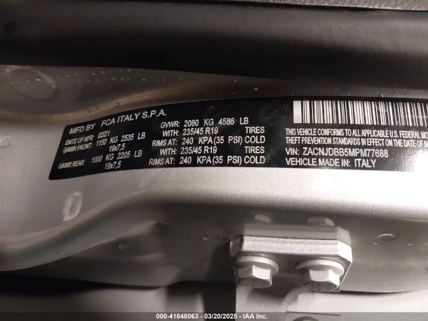 Цвет СеребряныйЦилиндры 4Привод Полный приводVIN ZACNJDBB5MP******Состояние НеизвестноПовреждения Передняя или задняяДата аукциона 2025-06-17